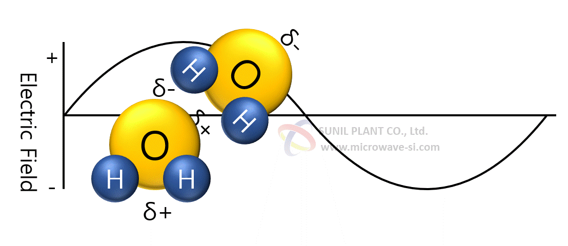 이에 반해 마이크로웨이브 가열은 유전 가열의 원리에 의해 피가열물(유전체) 자체가 발열체가 되는 내부가열방식이다. 일반적으로 재료의 분극기구는 전자분극, 원자분극, 쌍극자분극 또는 배향분극 및 공간전하분극의 네가지로 구분된다. 피가열물을 마이크로웨이브의 전기장 속에 두면 쌍극자 재배열에 의한 배향 분극이 발생하고, 쌍극자가 무질하게 배열된 유전체에 전자기장이 가해져 재료 내의 쌍극자들은 전자기장의 반대 방향으로 배향하려는 경향이 있고, 쌍극자들이 전자기장의 반대 방향으로 정렬되면 쌍극자에 의한 전자기장이 발생하므로 내부 전자기장이 감소된다. 외부 전자기장의 방향이 계속적으로 바뀌게 되면 쌍극자들이 계속 변하게 된다. 이 때, 마이크로웨이브와 같은 빠른 전자의 변화(2.45GHz의 경우 2십4억5천만회/초)가 유전체에 가해지면 질량과 관성을 가지는 물리적 실체인 쌍극자가 전기장이 변화하는 속도를 따르지 못하게 된다. 이로 인해 가해준 전기장에 대해서 위상 지연이 발생하게 되며, 지연되는 정도만큼 유전손실이 일어나 분자 내에서 쌍극자의 회전이나 진동이 발생하고, 그 내부 마찰에 의해서 열이 발생하여 유전체 전체가 발열 승온하는 것이 유전 가열의 개념이다.